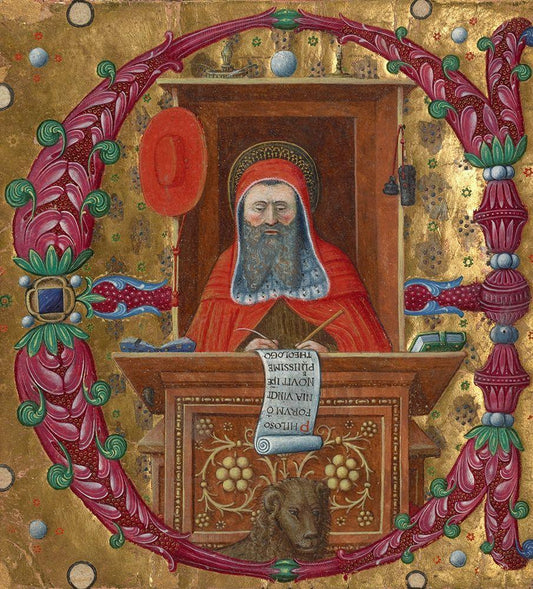 Initial E: Saint Jerome in His Study White Modern Wood Framed Art Print with Double Matting by Illuminator, Unknown 15th Century Italian