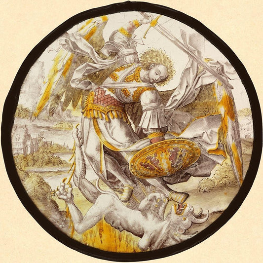 The Archangel Michael Vanquishing the Devil White Modern Wood Framed Art Print with Double Matting by Glassmaker, Unknown 16th Century Netherlandish