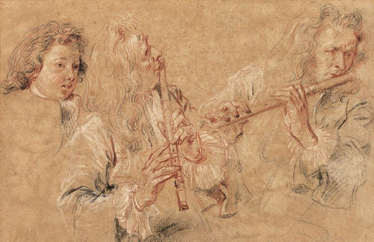 Two Studies of a Flutist and a Study of the Head of a Boy White Modern Wood Framed Art Print with Double Matting by Watteau, Jean-Antoine