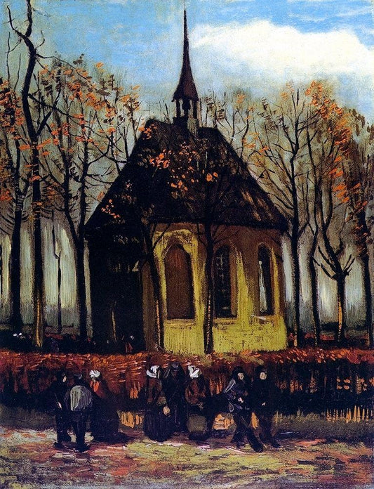 Chapel At Nuenen With Churchgoers White Modern Wood Framed Art Print with Double Matting by Van Gogh, Vincent