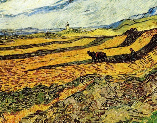 Ploughman And Mill White Modern Wood Framed Art Print with Double Matting by Van Gogh, Vincent