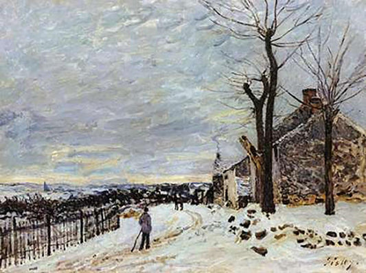 Snow On The Road Louveciennes White Modern Wood Framed Art Print with Double Matting by Sisley, Alfred