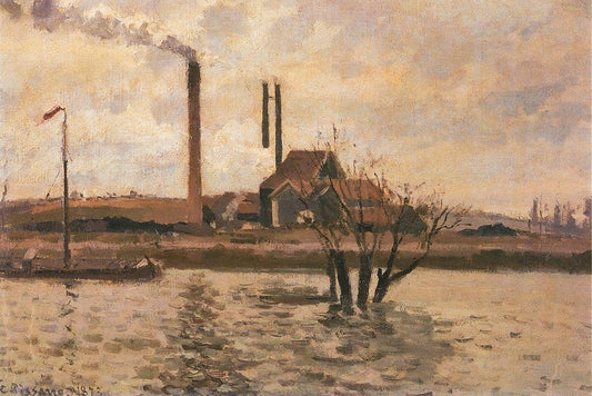 Factory at Sr Ouen-lAumone, the Flood of the Oise White Modern Wood Framed Art Print with Double Matting by Pissarro, Camille
