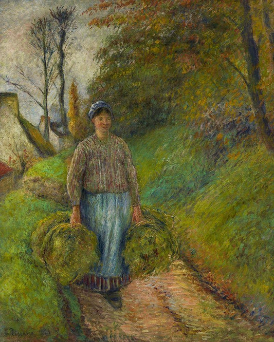Peasant Woman Carrying Two Bundles of Hay White Modern Wood Framed Art Print with Double Matting by Pissarro, Camille