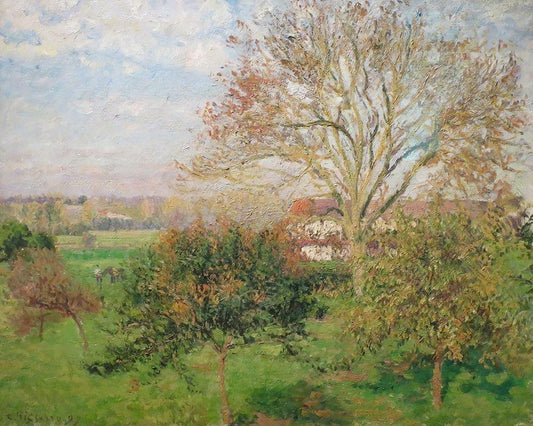The Big Walnut Tree, Autumn Morning, Eragny White Modern Wood Framed Art Print with Double Matting by Pissarro, Camille