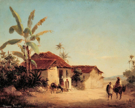 Landscape with Farmhouses and Palm Trees White Modern Wood Framed Art Print with Double Matting by Pissarro, Camille