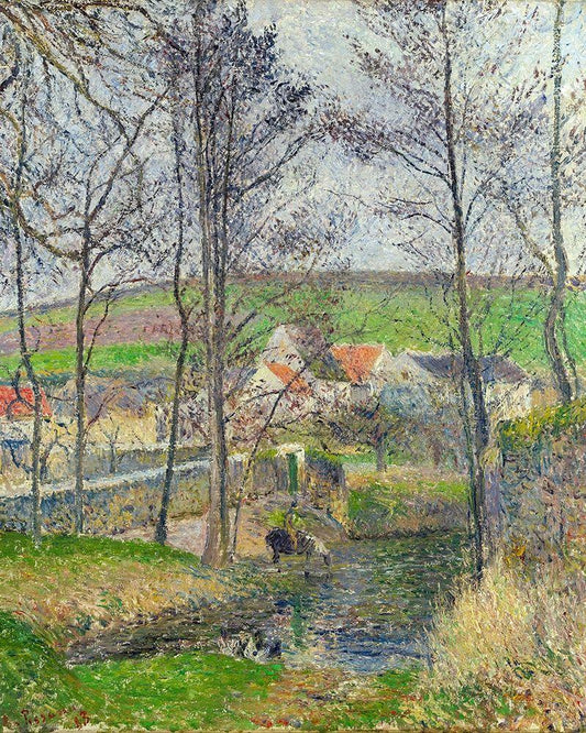 The banks of the Viosne at Osny in grey weather, winter White Modern Wood Framed Art Print with Double Matting by Pissarro, Camille