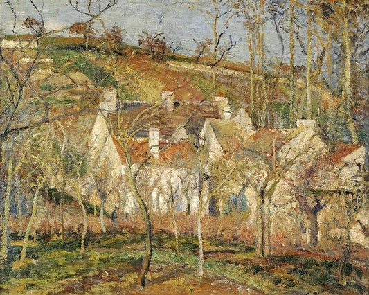 Red roofs, corner of a village, winter White Modern Wood Framed Art Print with Double Matting by Pissarro, Camille