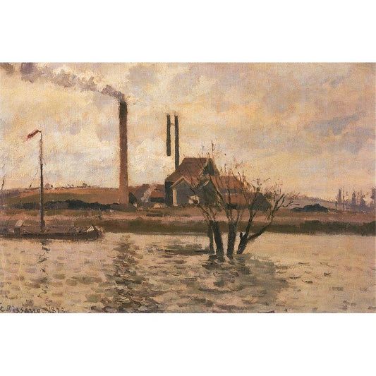 Factory at Sr Ouen-lAumone, the Flood of the Oise Black Modern Wood Framed Art Print with Double Matting by Pissarro, Camille