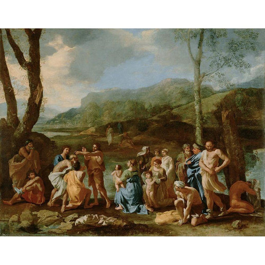 Saint John Baptizing in the River Jordan Black Modern Wood Framed Art Print with Double Matting by Poussin, Nicolas