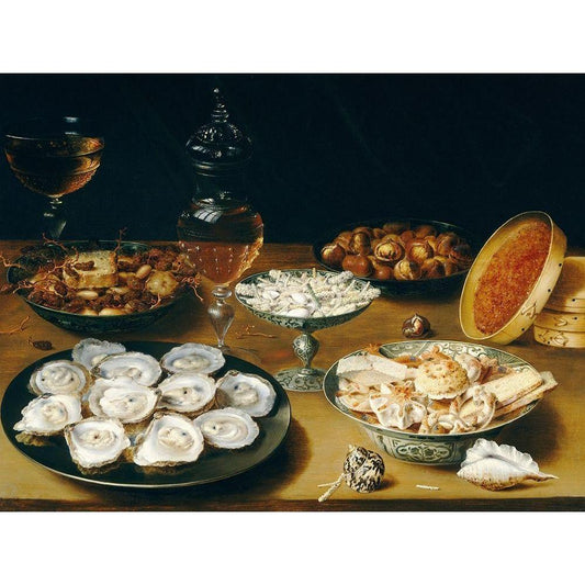 Dishes with Oysters, Fruit, and Wine at Still life Black Modern Wood Framed Art Print with Double Matting by Beert, Osias