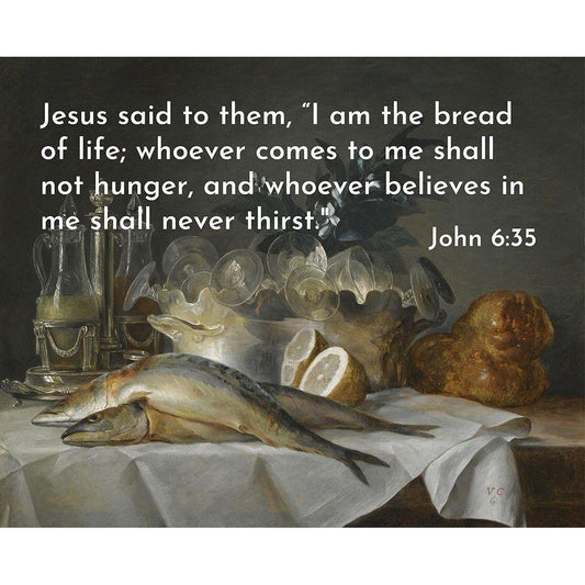 Bible Verse Quote John 6:35, Anna Vallayer Coster - A Still Life of Mackerel Glassware Black Modern Wood Framed Art Print with Double Matting by ArtsyQuotes
