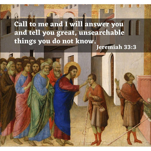 Bible Verse Quote Jeremiah 33:3, Duccio di Bunoninsegna - Jesus Opens the Blind Mans Eyes Black Modern Wood Framed Art Print with Double Matting by ArtsyQuotes