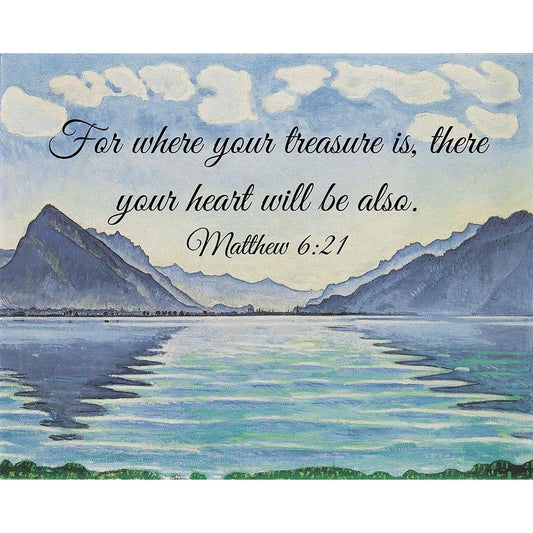 Bible Verse Quote Matthew 6:21, Ferdinand Hodler - Lake Thun with Symmetrical Reflection Black Modern Wood Framed Art Print with Double Matting by ArtsyQuotes