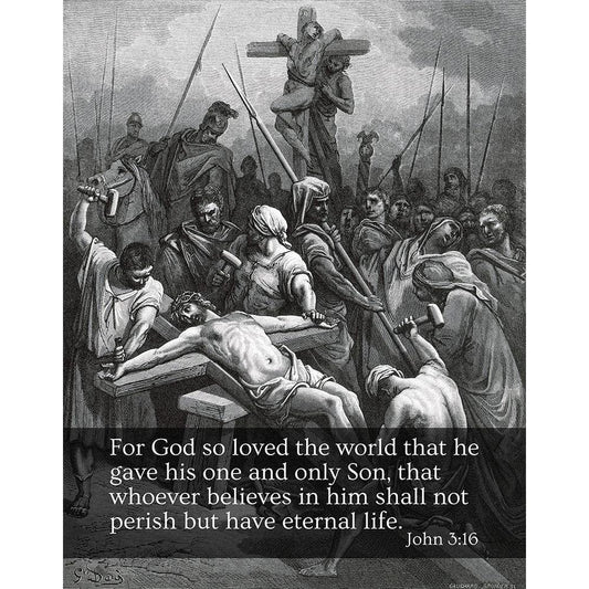 Bible Verse Quote John 3:16, Gustave Dore - Crucifixion of Jesus Black Modern Wood Framed Art Print with Double Matting by ArtsyQuotes