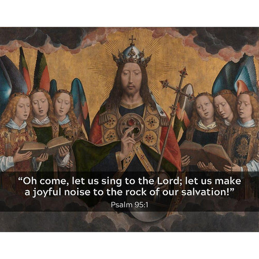 Bible Verse Quote Psalm 95:1, Hans Memling - Christ with Singing and Music Making Angels Black Modern Wood Framed Art Print with Double Matting by ArtsyQuotes