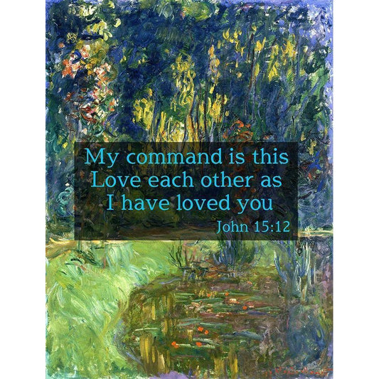 Bible Verse Quote John 15:12, Claude Monet - Water Lily Pond at Giverny Black Modern Wood Framed Art Print with Double Matting by ArtsyQuotes