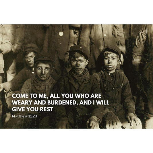 Bible Verse Quote Matthew 11:28, Lewis Wickes Hine, Group of Breaker Boys Black Modern Wood Framed Art Print with Double Matting by ArtsyQuotes