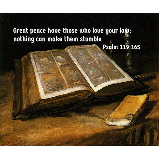 Bible Verse Quote Psalm 119:165, Vincent van Gogh - Still Life with Bible Black Modern Wood Framed Art Print with Double Matting by ArtsyQuotes