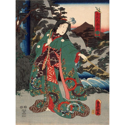 Costumes in Five Different Colors - Green (Ao) Black Modern Wood Framed Art Print with Double Matting by Kunisada (Toyokuni III), Utagawa