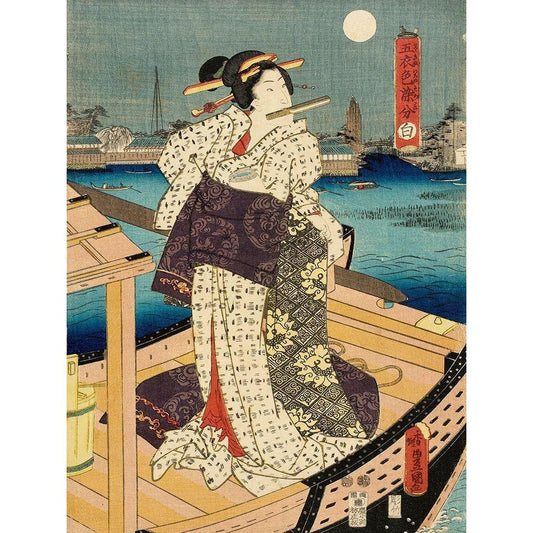 Breakwater Stakes and Ry?goku Bridge Black Modern Wood Framed Art Print with Double Matting by Kiyochika, Kobayashi