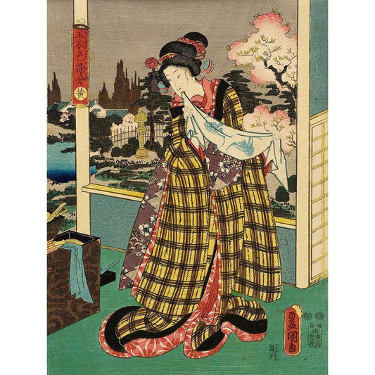 Costumes in Five Different Colors - Yellow (Ki) Black Modern Wood Framed Art Print with Double Matting by Kunisada (Toyokuni III), Utagawa