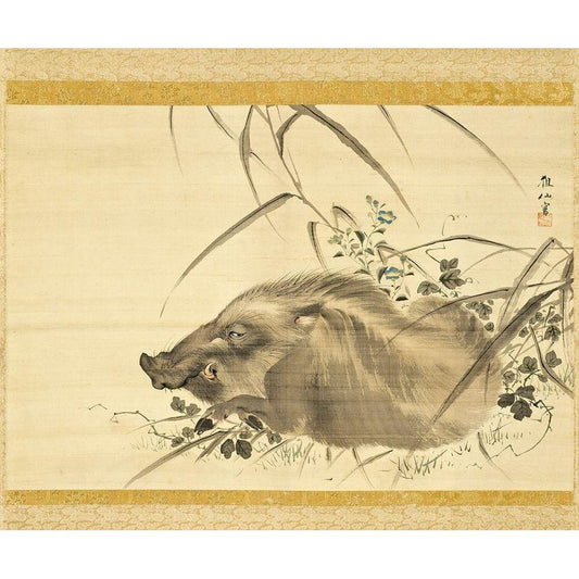 Wild Boar amidst Autumn Flowers and Grasses Black Modern Wood Framed Art Print with Double Matting by Sosen, Mori