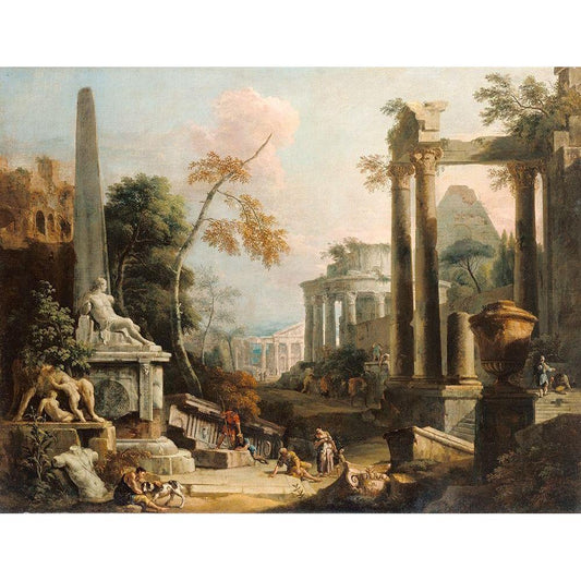 Landscape with Classical Ruins and Figures Black Modern Wood Framed Art Print with Double Matting by Ricci, Marco