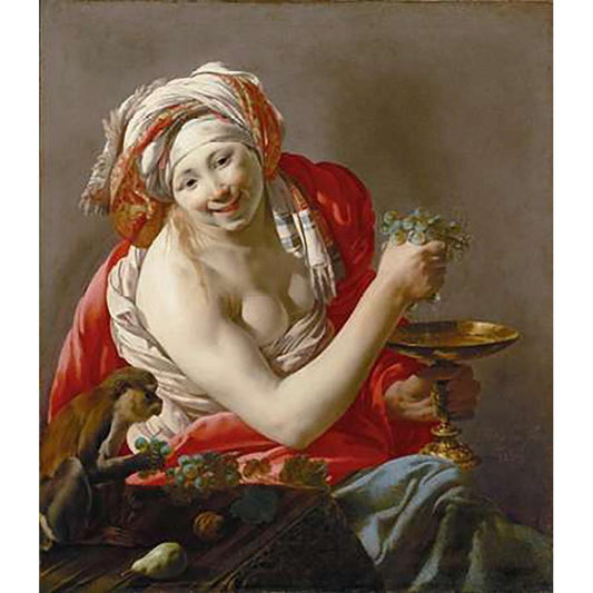 Bacchante with an Ape Black Modern Wood Framed Art Print with Double Matting by Ter Brugghen, Hendrick