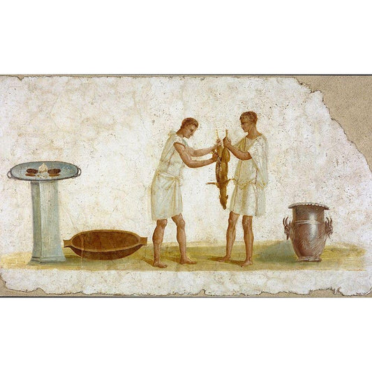 Fragment of a Fresco Panel with a Meal Preparation Black Modern Wood Framed Art Print with Double Matting by Artisan, Unknown 2nd Century Roman