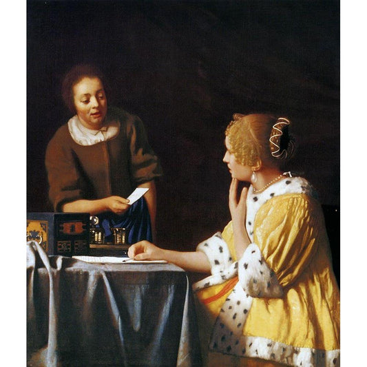 Lady With A Maidservant Holding A Letter Black Modern Wood Framed Art Print with Double Matting by Vermeer, Johannes