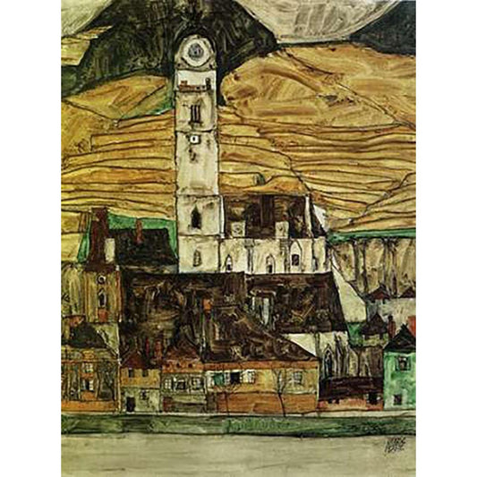 Stein On The Danube From The Kreuzberg 1913 Black Modern Wood Framed Art Print with Double Matting by Schiele, Egon