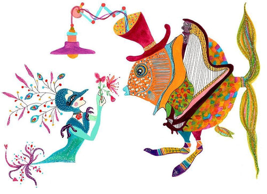 Harp Fishman White Modern Wood Framed Art Print with Double Matting by Kwerki Studios