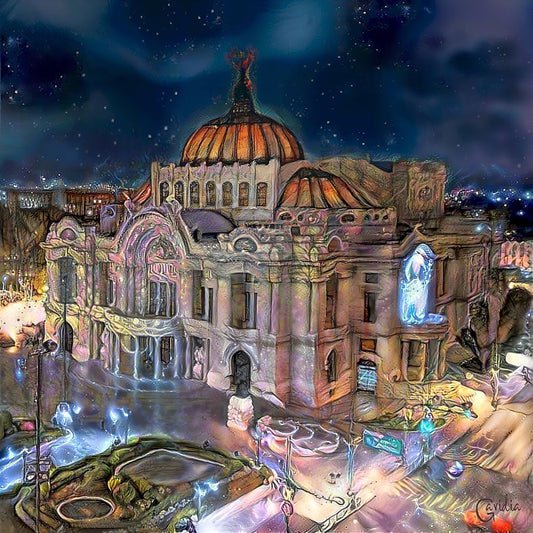 Mexico City Palace of Fine Arts at night White Modern Wood Framed Art Print with Double Matting by Gavidia, Pedro