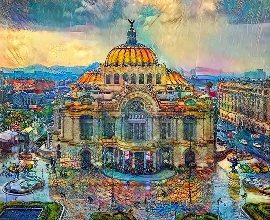 Mexico City Palace of Fine Arts in the rain White Modern Wood Framed Art Print with Double Matting by Gavidia, Pedro