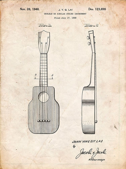 PP1117-Vintage Parchment Ukulele Patent Poster White Modern Wood Framed Art Print with Double Matting by Borders, Cole