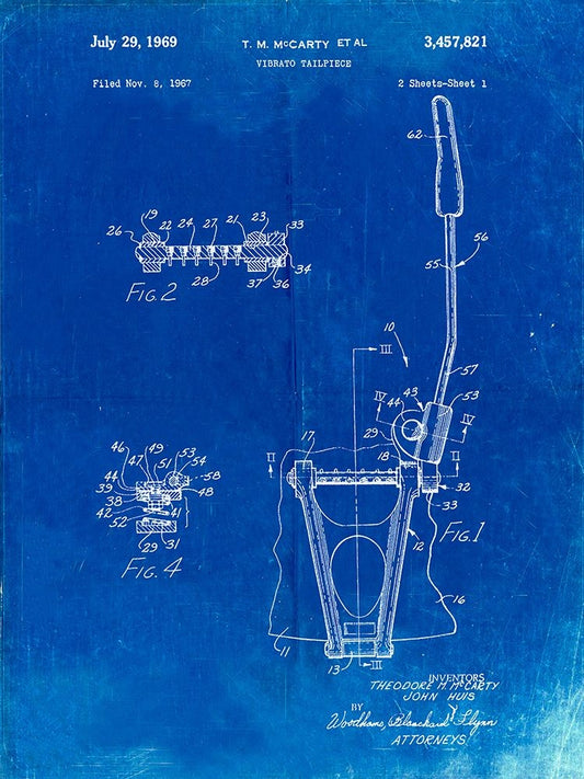 PP1122-Faded Blueprint Vibrato Tailpiece Patent Wall Art Poster White Modern Wood Framed Art Print with Double Matting by Borders, Cole