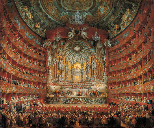 Festa In Teatro A Roma Black Ornate Wood Framed Art Print with Double Matting by Panini, Giovanni Paolo
