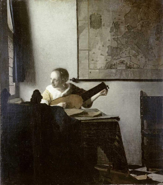 The Lute Player Black Ornate Wood Framed Art Print with Double Matting by Vermeer, Johannes