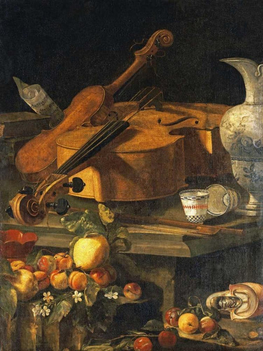 A Violin, a Cello, a Bow, a Sheet Black Ornate Wood Framed Art Print with Double Matting by Munari, Christoforo