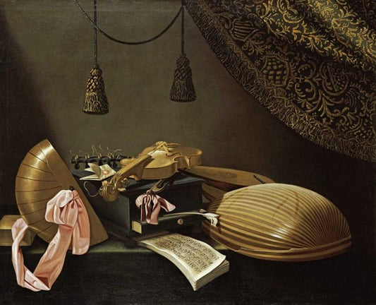 Lutes and Violin on a Table Black Ornate Wood Framed Art Print with Double Matting by Baschenis, Evaristo