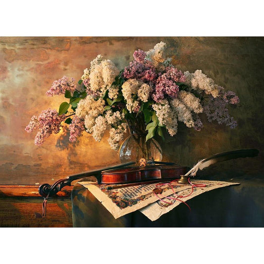 Still Life With Violin And Lilac Flowers Black Modern Wood Framed Art Print by Morozov, Andrey