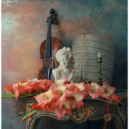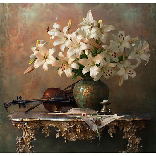 Still Life With Violin And Lilies Black Modern Wood Framed Art Print by Morozov, Andrey