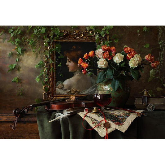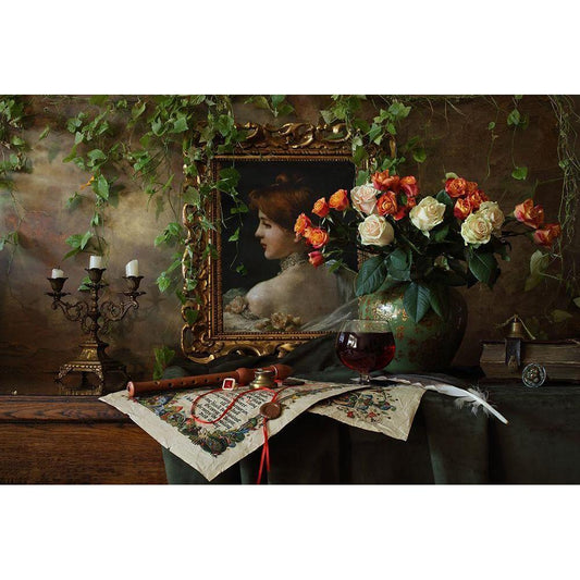 Still Life With Flowers And Picture Black Modern Wood Framed Art Print by Morozov, Andrey