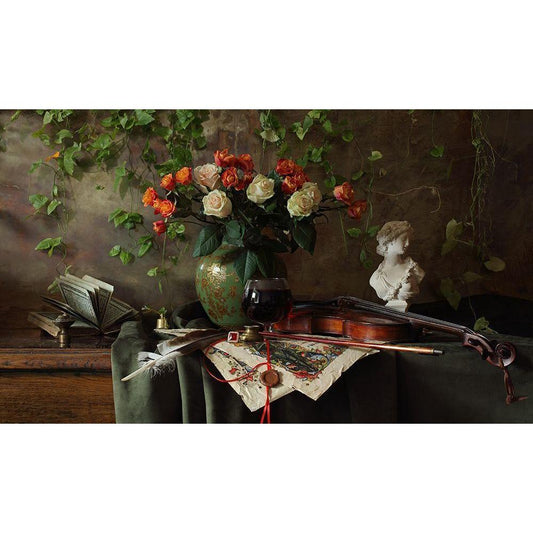 Still Life With Violin And Flowers Black Modern Wood Framed Art Print by Morozov, Andrey