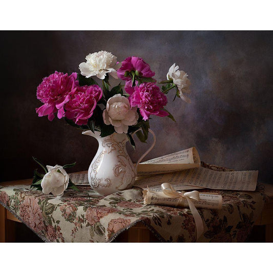 Still Life With Peonies Black Modern Wood Framed Art Print by Lankina, Alina