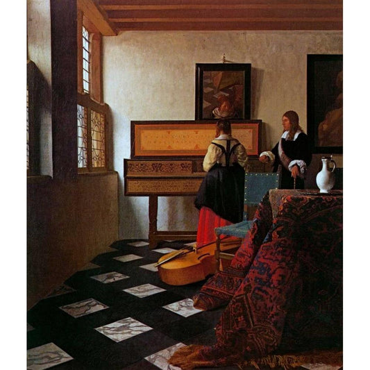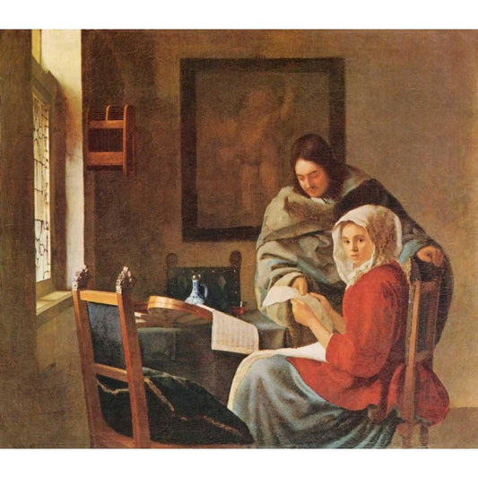 Gentleman And The Girl With Music Black Modern Wood Framed Art Print by Vermeer, Johannes