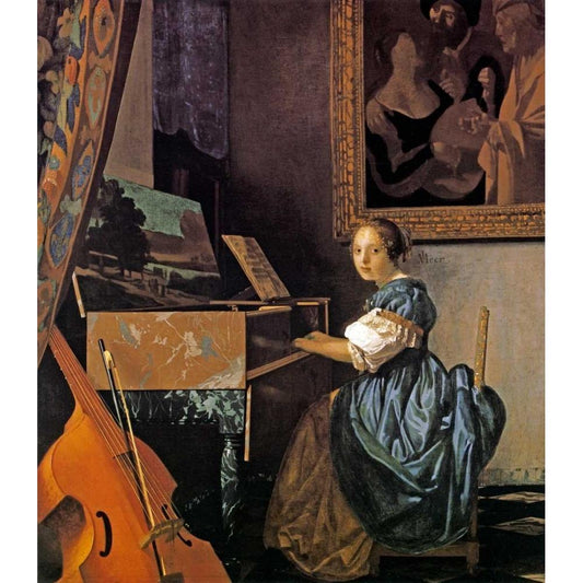 Lady Seated At A Virginal Black Modern Wood Framed Art Print by Vermeer, Johannes