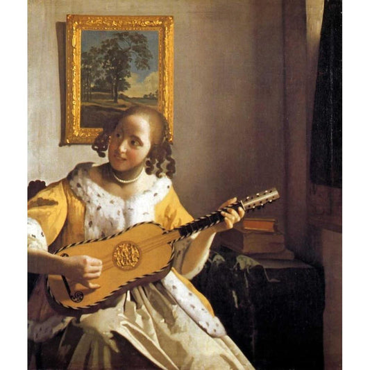 The Guitar Player Black Modern Wood Framed Art Print by Vermeer, Johannes