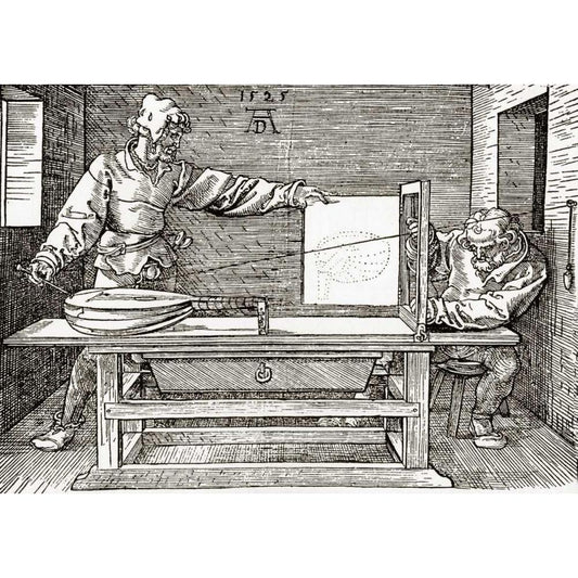 A Man Drawing A Lute Black Modern Wood Framed Art Print by Durer, Albrecht